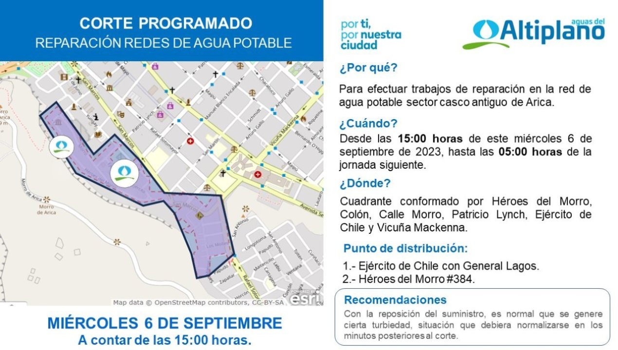 Según indicó Marcos Lastra Agurto, para esa jornada se dispondrá de dos puntos de distribución de agua alternativos los cuales estarán ubicados en Ejército de Chile con General Lagos y en Héroes del Morro #384. Para dudas o consultas se puede visitar la página web www.aguasdelaltiplano.cl o bien canalizar las inquietudes a través del Call Center 600 600 9900.