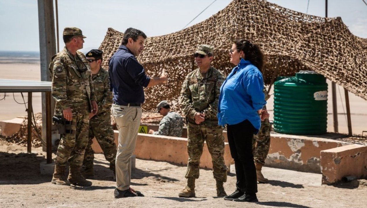 Hasta el punto de observación ubicado en la frontera de Chile, llegaron el alcalde de Arica, Gerardo Espíndola, y la ministra de Defensa, Maya Fernández, para conocer importantes detalles del trabajo que hace once meses realiza el Ejército en el marco de la ley de Infraestructura Crítica aprobada para enfrentar la crisis migratoria que vive nuestro continente.